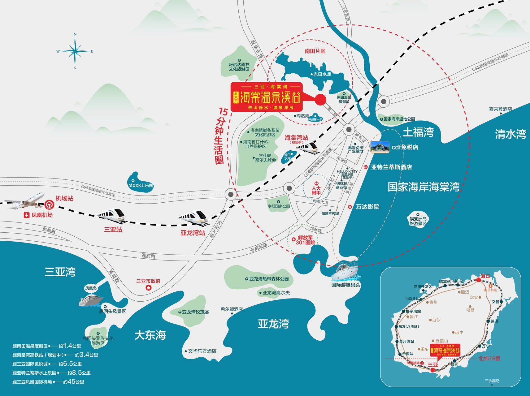 项目位于国家海岸海棠湾南田温泉度假区门户位置,海棠湾区南田农场纬二路,地段优越,接驳东线高速。距免税城6.5公里 约10分钟车程,距解放军301医院17公里 约25分钟车程,距未来开通的海棠湾高铁站5分钟车程,距三亚市中心及凤凰机场45公里 约45分钟车程。项...