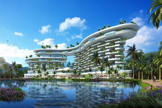 国美海棠湾项目总建筑面积136453平方米,规划有一栋品*牌酒店、96栋海棠湾游艇别墅以及云境空中花园、云秀中*心、云之恋浪漫圣堂、SPA、影院等。酒店以“云境”作为设计概念,二个高低不同的云状空中花园成为项目的标志与灵魂。二百余米长的二座空中花园,将海棠湾山、海、河湾美景全景俯瞰,尽收眼底。同时将空中泳池、花园观景、娱乐、酒吧、餐饮、婚礼堂、SPA、艺术画廊等功能特色地结合在一起,打造起美丽的空中花园,带给海棠湾独*特创意体验,为酒店注入了强大活力与品*牌。