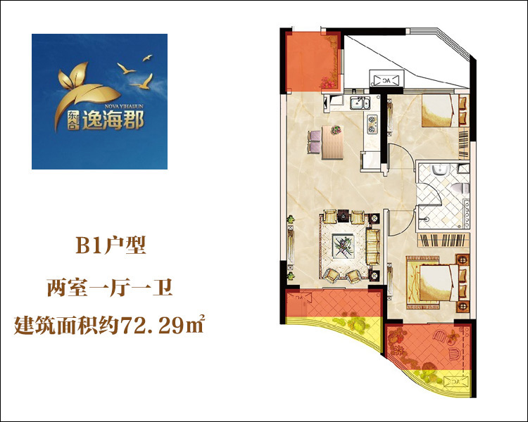 B1户型2室1厅1卫约72.29㎡