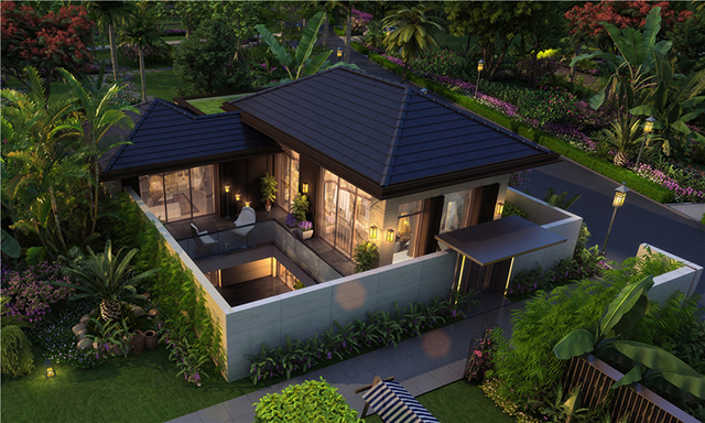 融创海棠湾坐落于国家海岸海棠湾,北启海棠湾,南接亚龙湾,环抱铁炉港原生内海,坐拥两湾一海。项目总占地3800亩,规划建筑880亩。区域内分区明显,南区为多元文化度假区,中区是高端休闲度假区,北区则是综合休闲游憩区。项目采用低调奢华的背景,两侧浓郁的绿树掩映,以柔软的线条创造完美的过渡空间。在整体布局上,项目追求「通、透、旷」的境界,各个院落中,建筑错落有致,与院墙、游泳池构成一个完美的组合。