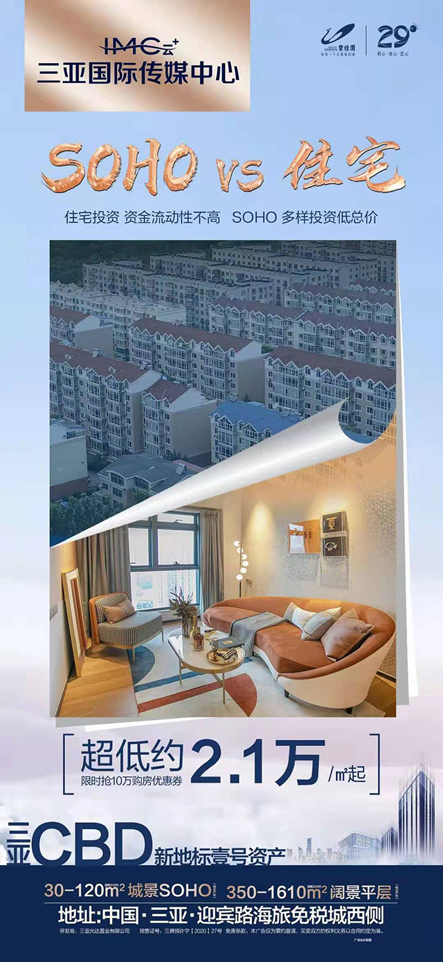 碧桂园三亚国际传媒中心项目建筑面积30-120㎡城景SOHO、350-160㎡阔景平层,均价约20700元/㎡起,全款享95折。以上信息供参考,具体信息仍需参考现场实际销售情况。欲知更多楼盘详情,欢迎来电咨询!