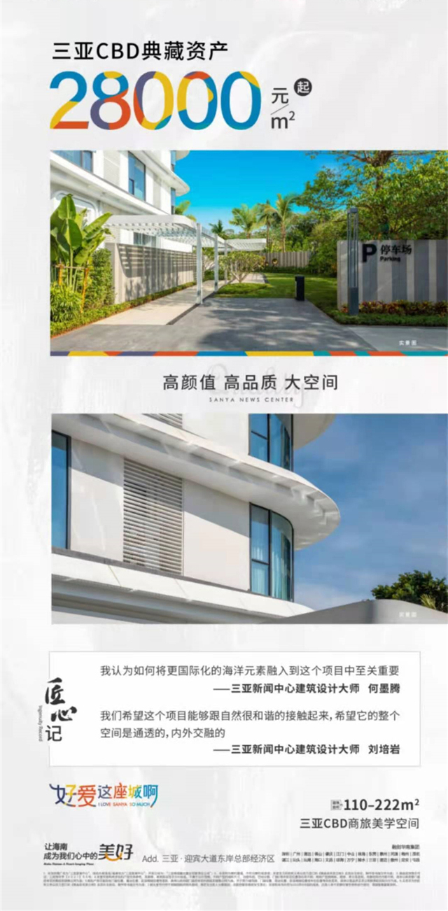 三亚新闻中心项目是融创进驻三亚C B D一个商业项目,落子迎宾大道东岸总部经济区—海南自贸港园区之 一,据守迎宾路中轴,交通便捷,医疗教育资源丰富;项目占地面积约3.19万㎡,建筑面积约13.85万㎡,项目户型建筑面积约110-220㎡的513套办公产品及47套商铺组成,打造融合信息化,多媒体,时尚艺术,人文文化等多维复合空间,重塑城市的生态,智慧与活力。